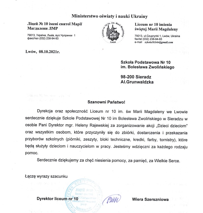 Bardzo dziękujemy wszystkim uczniom i ich rodzicom za pomoc i otwarte serca. Jesteśmy pewni, że nasi rówieśnicy z Ukrainy ucieszą się